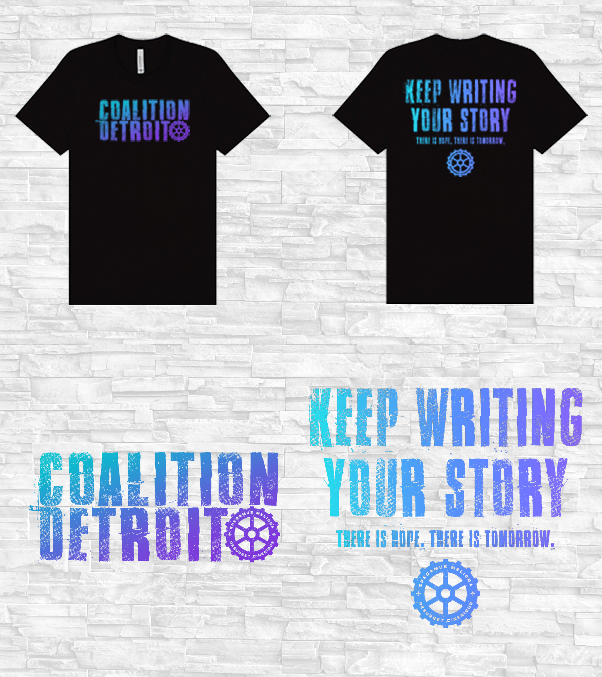 The Coalition Detroit is supporting Six Feet Over, a local nonprofit that provides “financial and emotional support for survivors of suicide loss and individuals with lived experience of suicide, while engaging in community prevention through mental health education and advocacy to support healthier futures”, with our “Keep Writing Your Story” shirt.